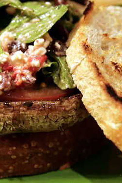 5. Toss salad greens with the red pepper mixture. Place the grilled mushrooms top-side down on 4 half-slices of the bread. Top with the salad mixture and the remaining bread.
