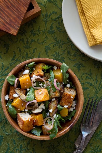 Try this nutrient dense side dish at your Holiday table. Panzanella salad is a traditional Italian side that uses day-old bread, tomatoes and onions (and whatever fresh herbs you may have). This version adds a healthy and flavorful boost of butternut squash, mushrooms and pistachios! I threw in some goat cheese for a flavor punch as well.