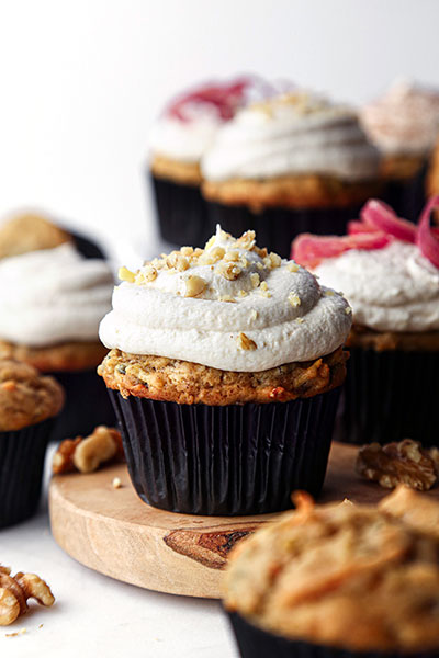 Place the frosting into a piping bag (or plastic baggie with the tip of the corner cut off) and pipe frosting onto each muffin, in a circular motion. Top with cinnamon, shredded carrot, or chopped walnuts. Makes 12-14 muffins.